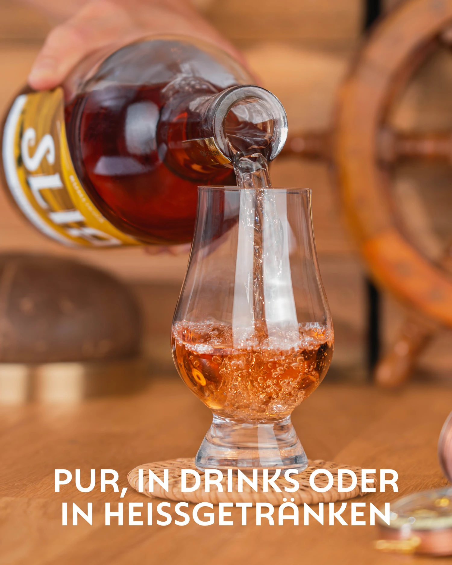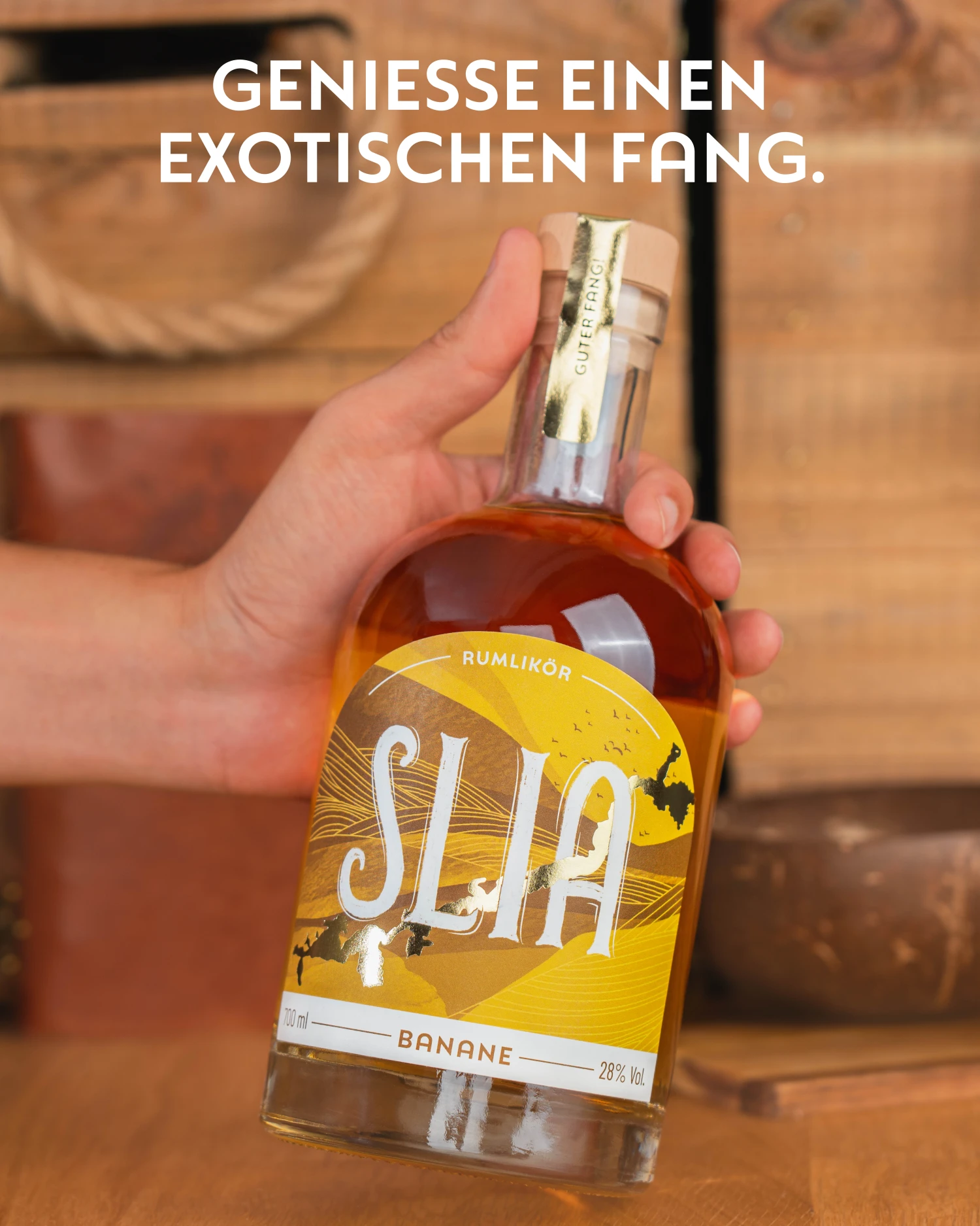Der vielversprechende SLIA Banane Rumlikör ist eine Kreation von Rum & Co. Mit der Eigenmarke SLIA wagt der Spirituosenversand aus Deutschland derzeit den Launch eines neuen Projektes mit enormem Potenzial. Das Ziel hinter der Spirituosenmarke ist es, der Heimat Tribut zu zollen. So sind der SLIA Banane Likör und die übrigen Produkte nach der Schlei benannt. Der „Ostseefjord“ mit faszinierender Geschichte und wunderschöner Natur dient als Produktionsstandort. Das greift der SLIA Banane Rumlikör mit seinem Namen auf, denn das Wort „Slia“ ist die altsächsische Bezeichnung für die Schlei. Darüber hinaus spiegelt sich die maritime Prägung im Produktdesign samt Wellen wider. Eine einzigartige Flora und Fauna zeichnen die Region aus. Sie faszinierte einst sogar die Wikinger, wobei sie außerdem untrennbar mit der Fischerei verbunden war. Und welche Spirituose besitzt ihrerseits eine enge Verbindung zur Seefahrt? Natürlich der Rum, der daher die Grundlage für diesen Likör darstellt. Als Basis verlässt sich der Produzent aus der Region auf hochwertigen Bajan Rum aus Barbados. Dabei handelt es sich um einen Blend aus unterschiedlich lang gelagerten Barbados Rums, aus Melasse destilliert und anschließend bei tropischem Klima in Eichenfässern gereift. Auf diese hochwertige Basis treffen reife Bananen, die ebenfalls aus den Tropen kommen. Das Endergebnis ist eine Spirituose, die sowohl Kenner als auch Einsteiger in ihren Bann schlägt.