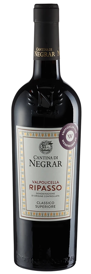 Als Valpolicella Ripasso Classico Superiore erfüllt dieser Rotwein der Cantina Negrar die höchsten Qualitätsanforderungen für diese Weingattung. Um als „Superiore“ klassifiziert zu werden, müssen strenge Vorgaben zur Qualität des Leseguts und in Bezug auf den Ausbau des Weines eingehalten werden. „Classico“ wiederum weist auf eine örtlich genau begrenzte Herkunft innerhalb des DOC-Gebiets hin, die ebenfalls für eine besonders hohe Qualität steht.